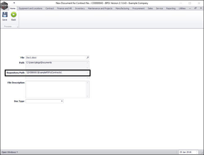 - The Repository Path is auto populated according to the path that has been set up in the company configuration.