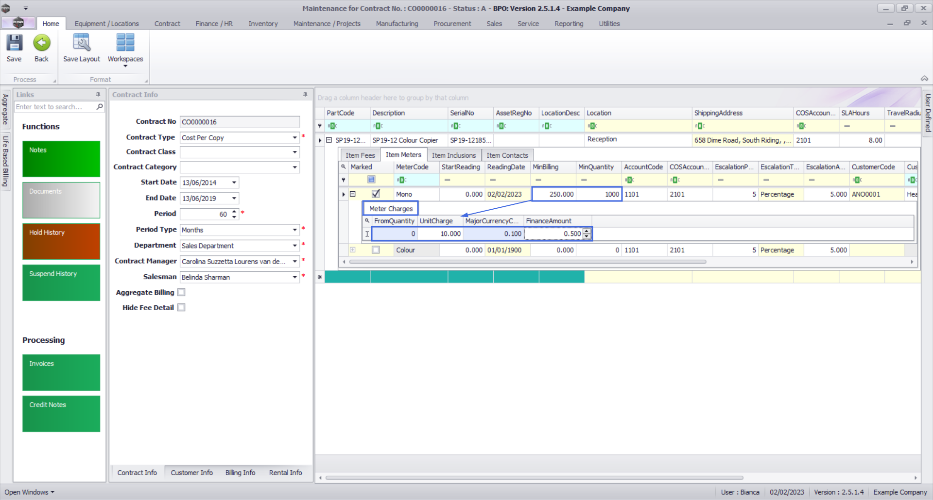 - In this image, the mono meter has a minimum billing set up of a R250 charge for the first 1000 copies (Minimum Quantity). BPO calculates the usage charges by first calculating the minimum billing set up. In this example, it means in BPO, a fixed charge of R250 will be applied for any number of mono copies made on this contract item the first copy up to and including 1 000 thereafter a unit charge per copy will be applied i.e from 1001.