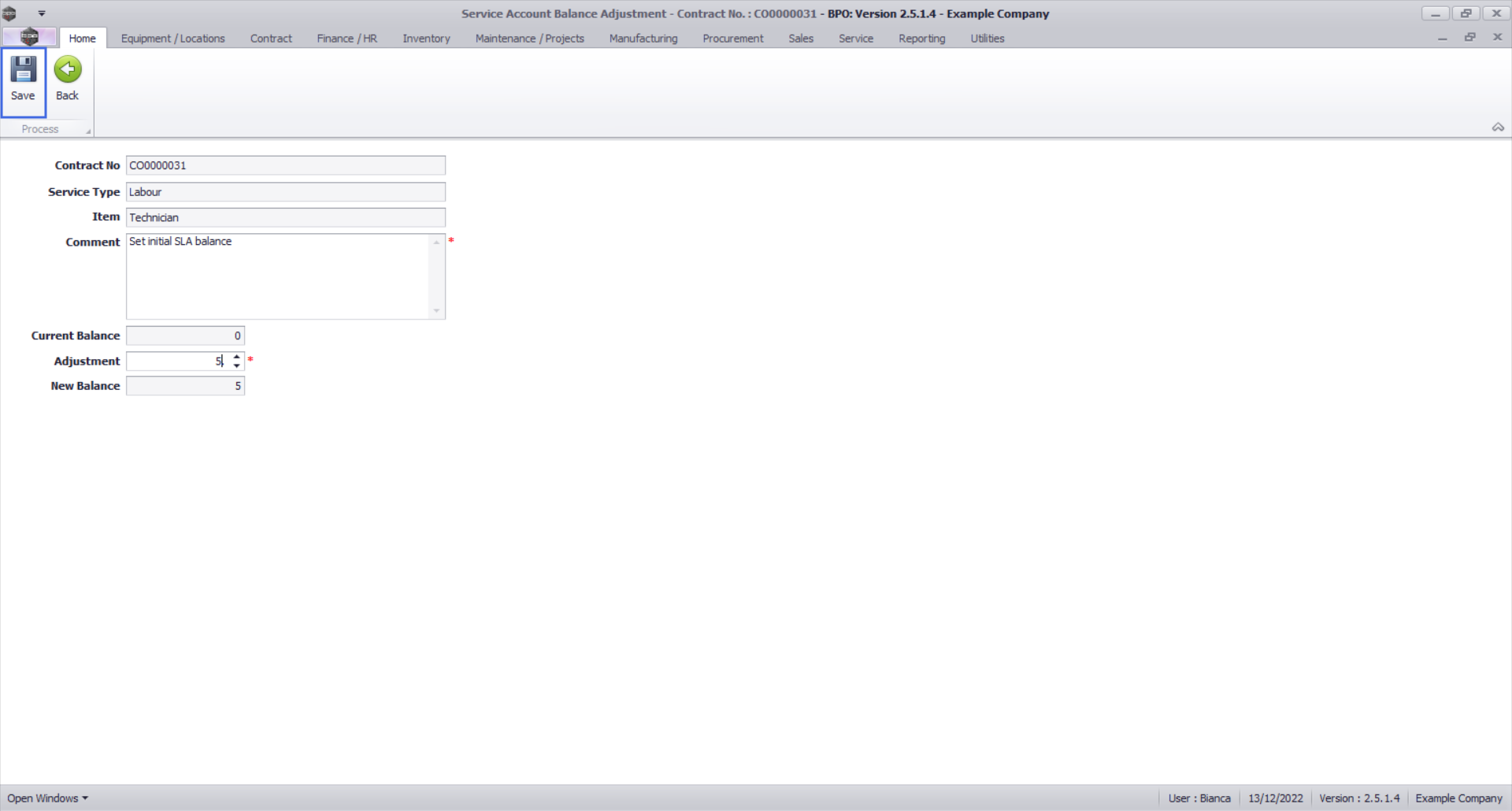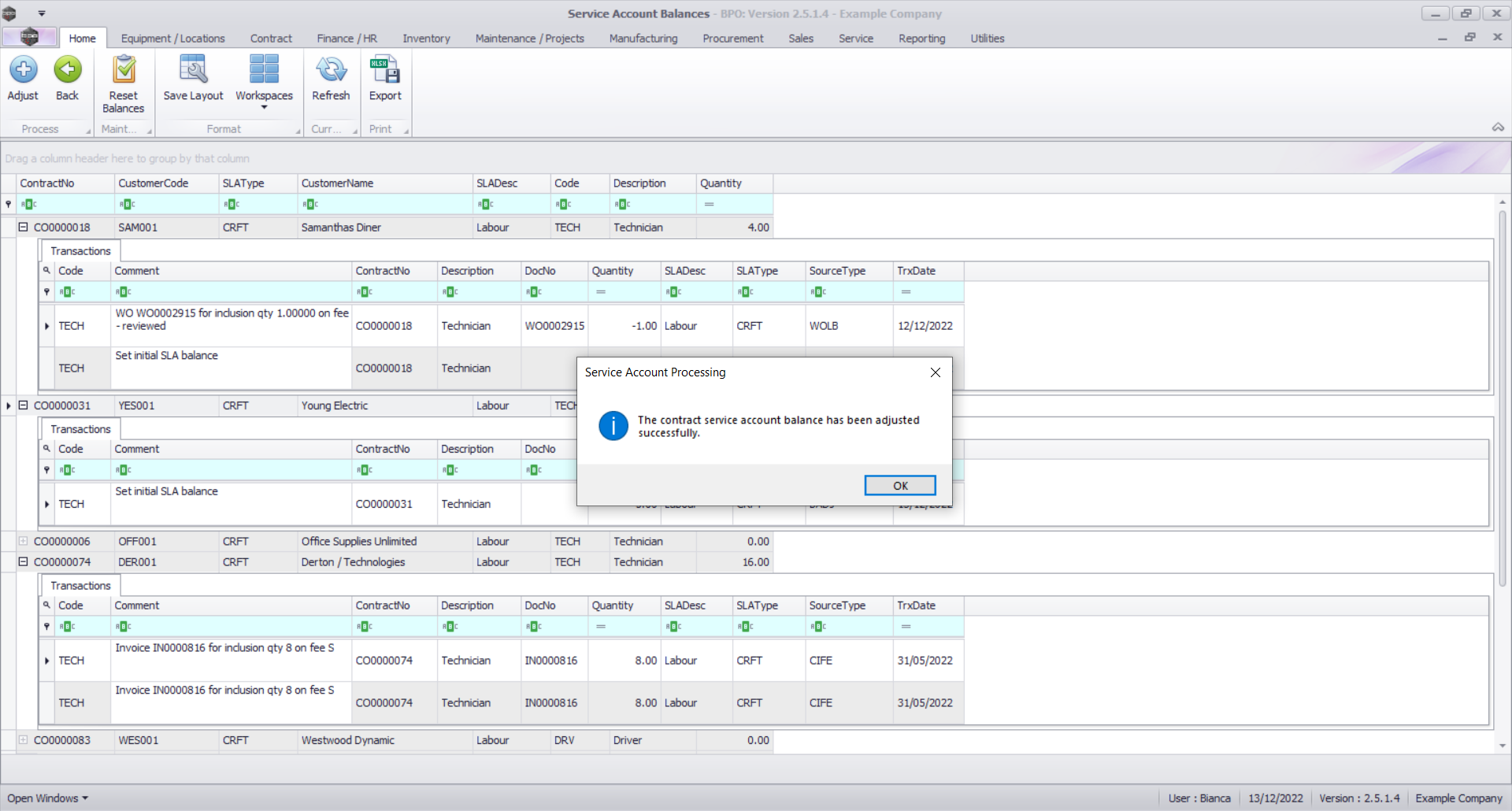 - The contract service account balance has been adjusted successfully.