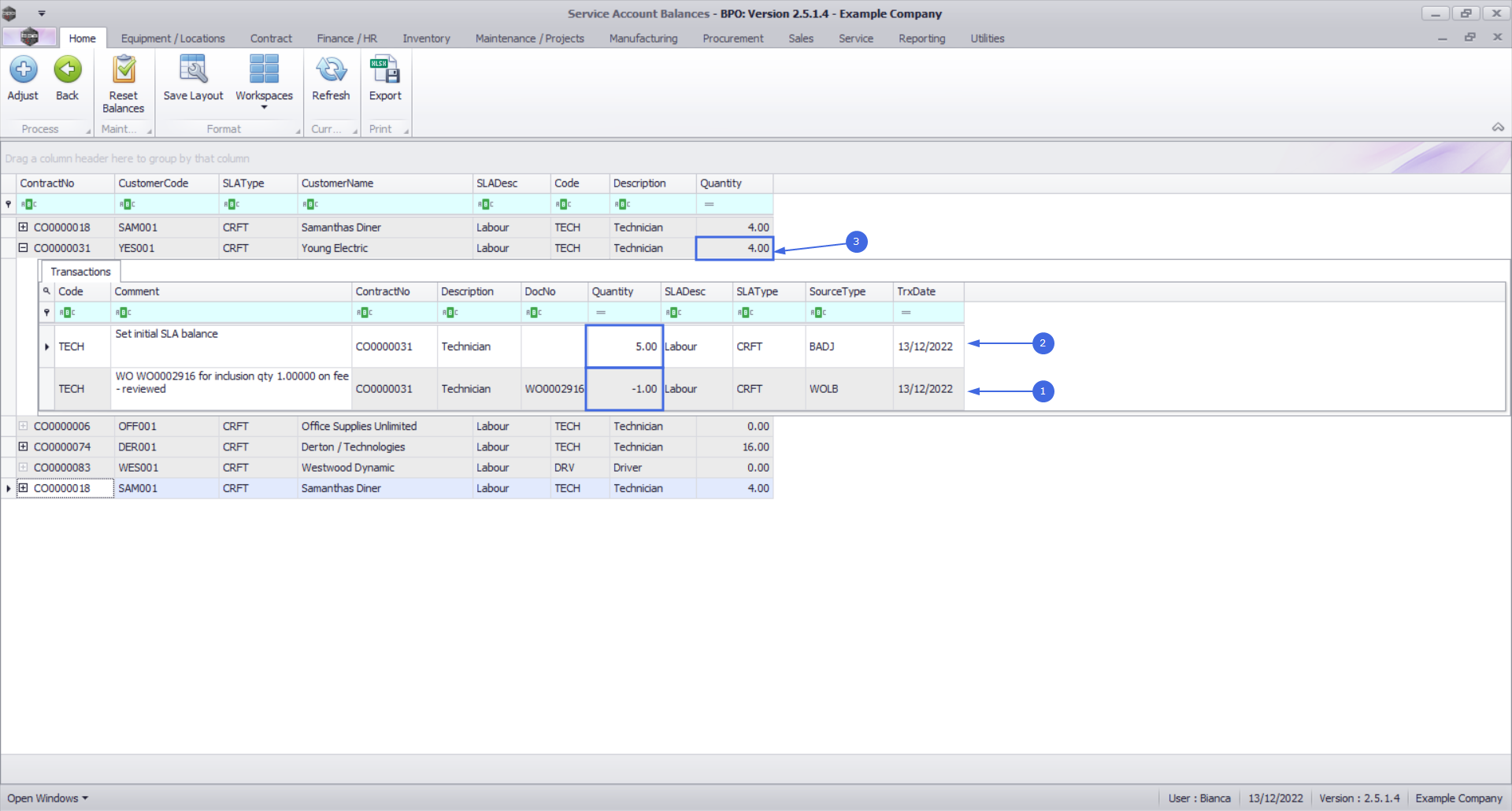 - After logging 1 hour technician time against the work order and then reviewed and allocated as SLA in the Time Review screen , the Quantity is now 4.