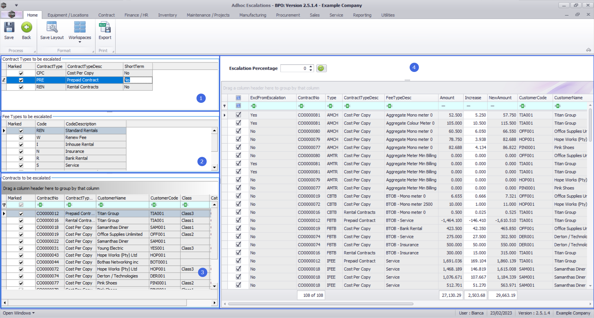 The Adhoc Escalations screen will be displayed, listing all Active contracts. This screen is divided into 4 frames: