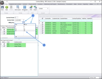 - You may have contracts configured to bill on the 1st , 25th and 30th , as in this example. This will give you the option to multi-select on the contracts that you wish to bill currently.