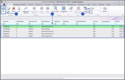 - The newly raised credit note can be viewed in the data grid. You will note that a Credit Note No. has now been generated.