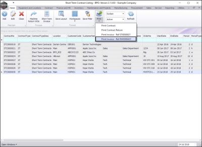 - Select the row of the short term contract where you wish to print the deposit invoice.