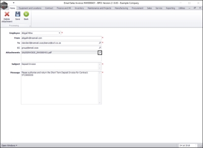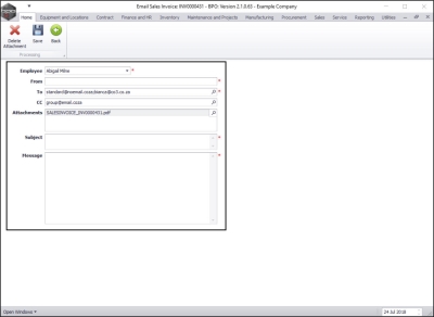 - Email: - can attach documents, add recipients, the system will create a PDF and email the Invoice.