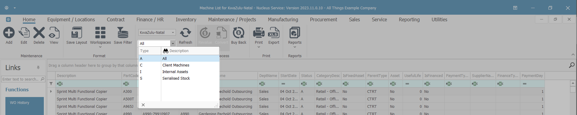 - The Nucleus Asset Listing screen contains a data grid of all type of items; Client Machines, Internal Assets and Serialised Stock but the latter are not actually 'assets' until the above-mentioned conversion.