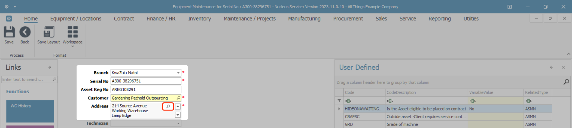 - Work Order No: This field will only be displayed if the item is currently linked to a Work Order, the Parent Type of the item is WKOR.