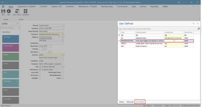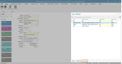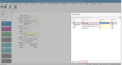 A User Defined panel has been added to the Asset Maintain screen (the Equipment Maintenance for Serial No: [] screen).