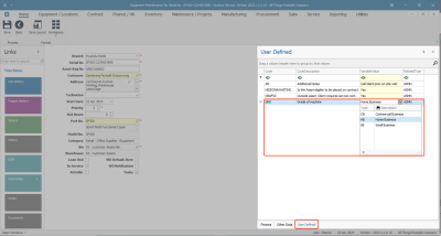 At present, these fields in the Equipment - Assets module can be used to add extra information relevant to the selected asset. The added fields will reflect in the User Defined panel in the Asset Maintain screen across all assets on the system, but the Variable Values selected for each User Defined field will be unique to the selected asset.