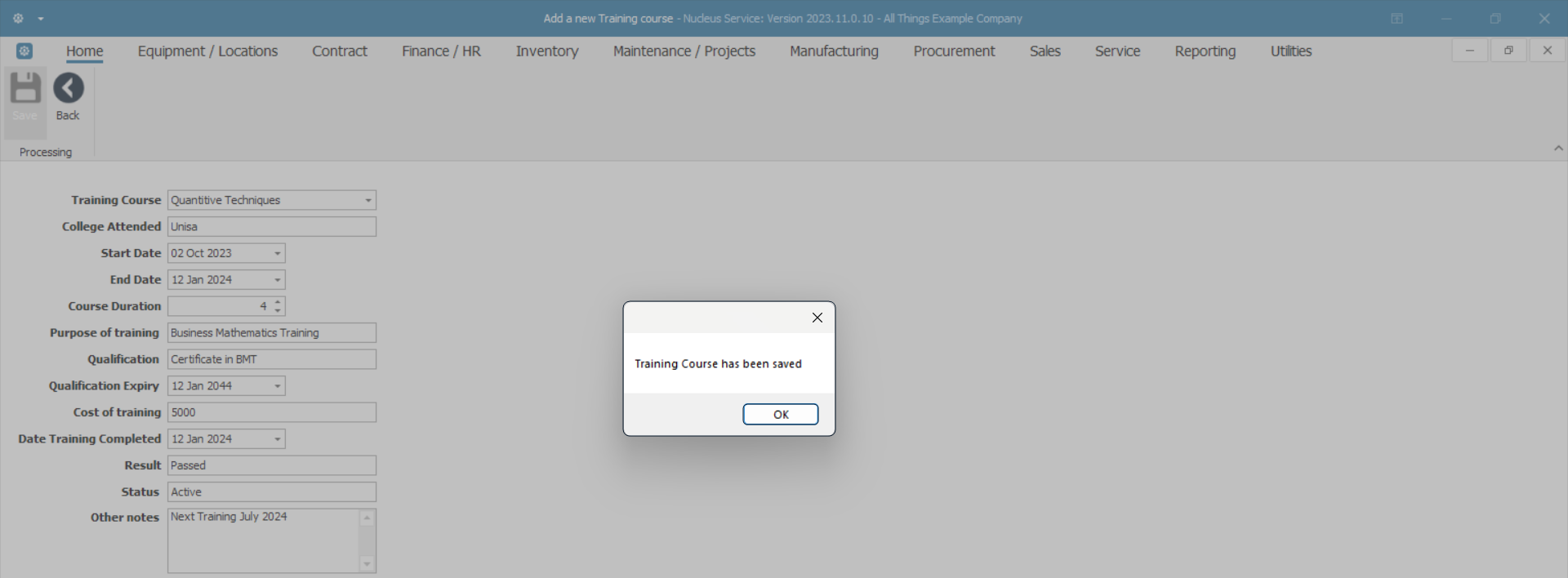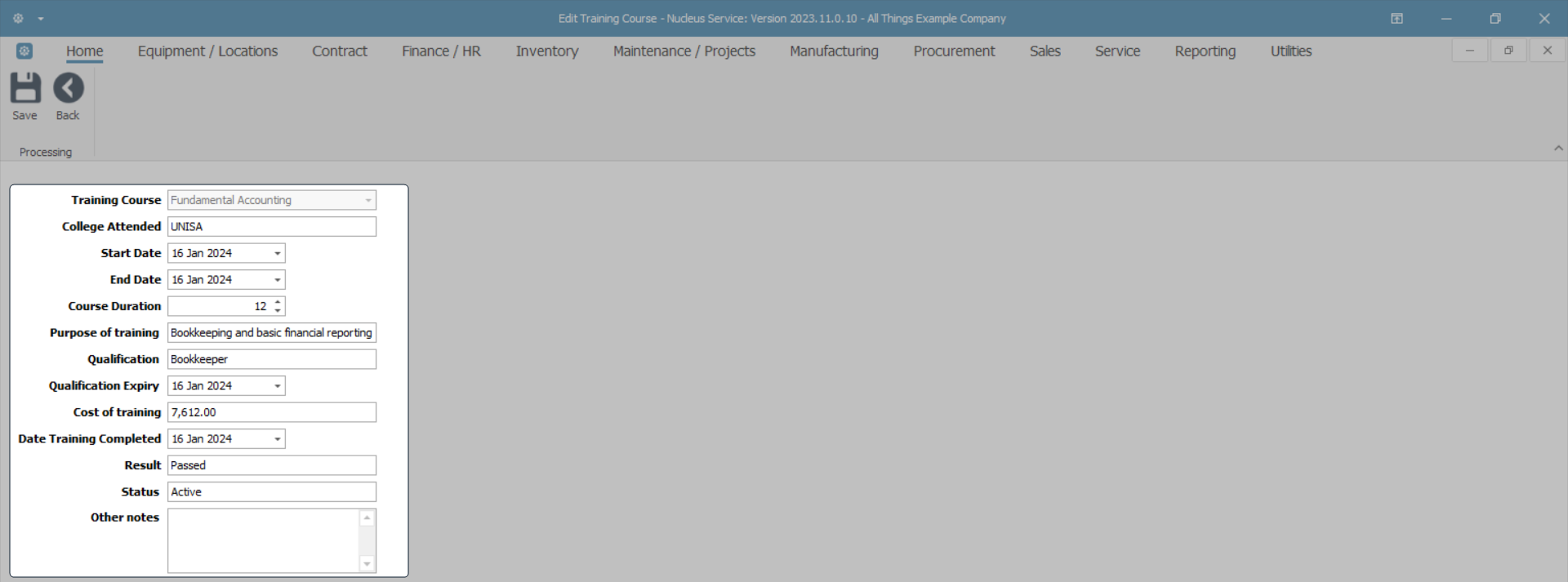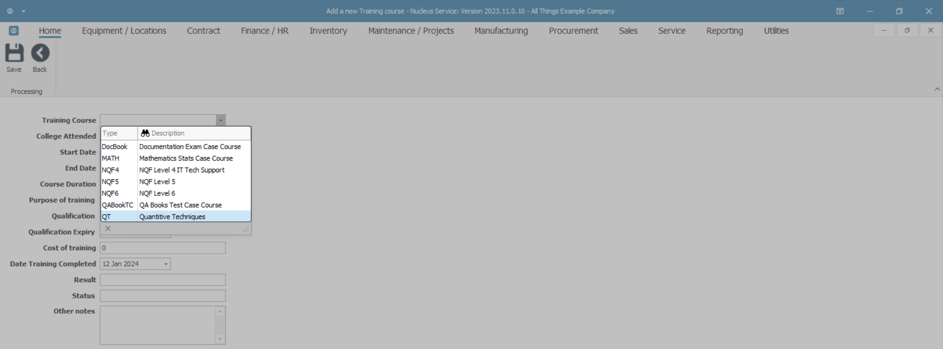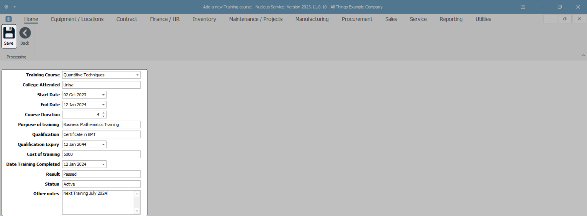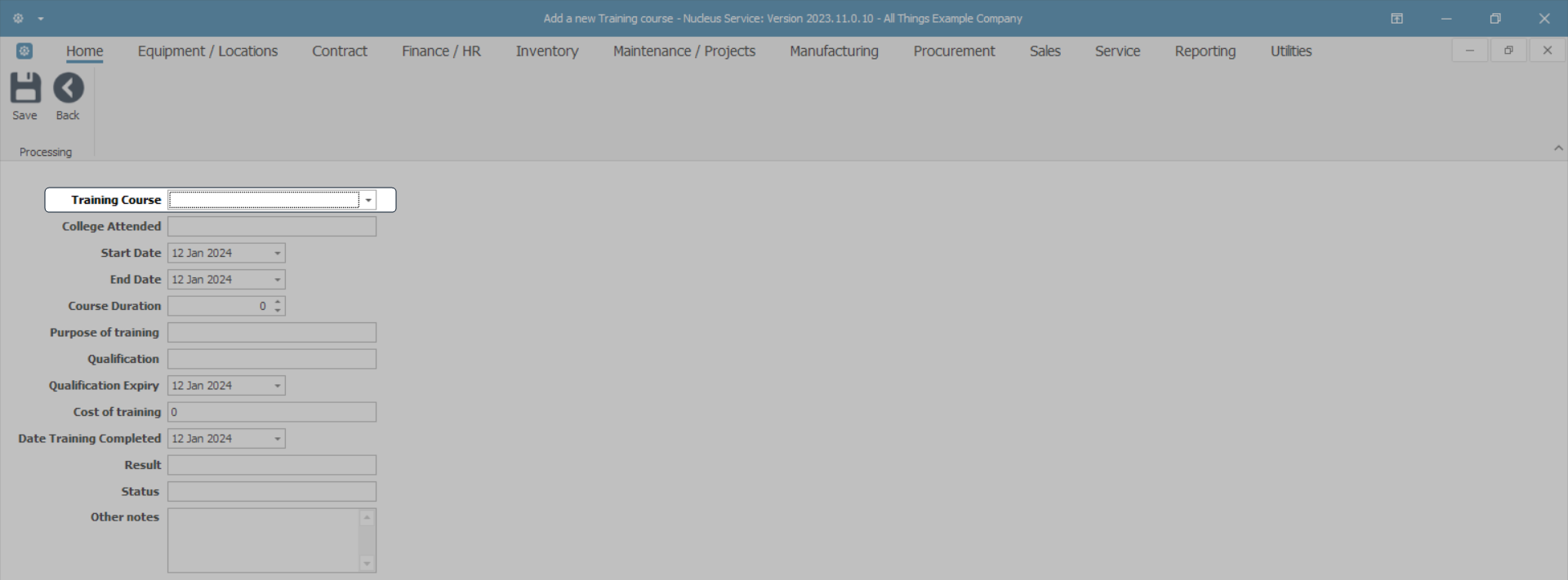 - The Training Course field is inactive and 'greyed out', therefore the information in this field cannot be edited from this screen.
