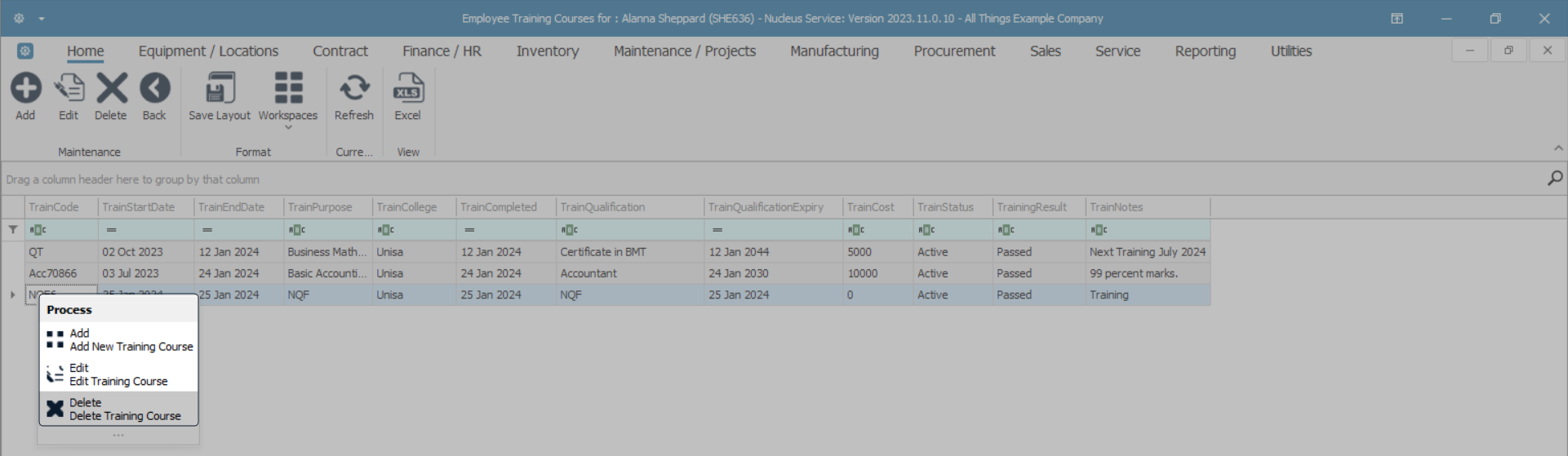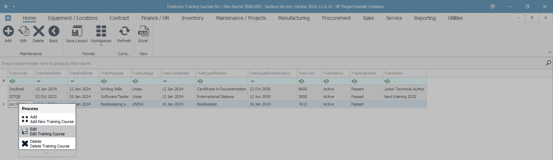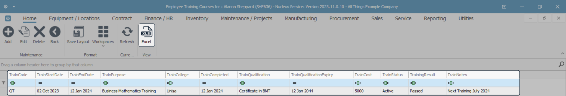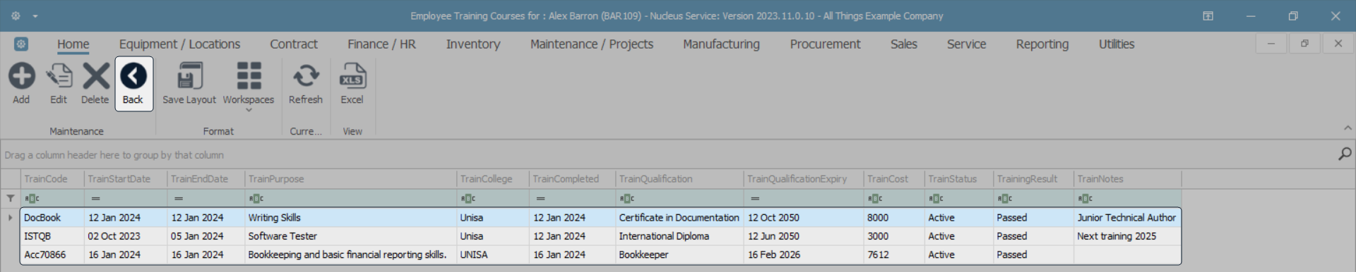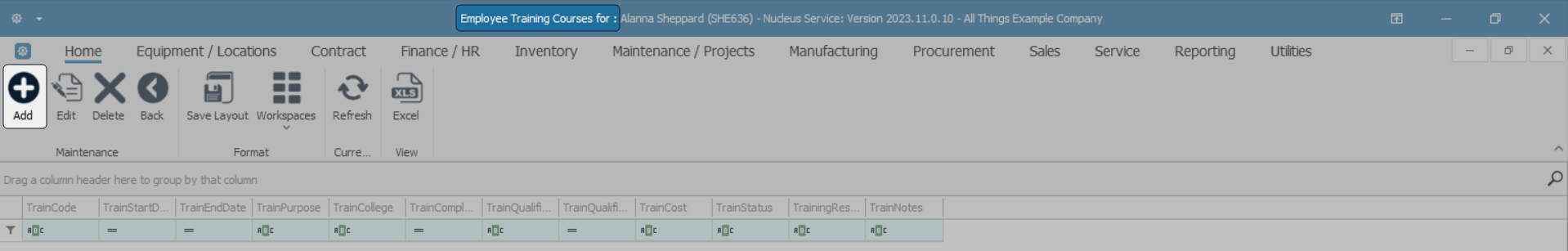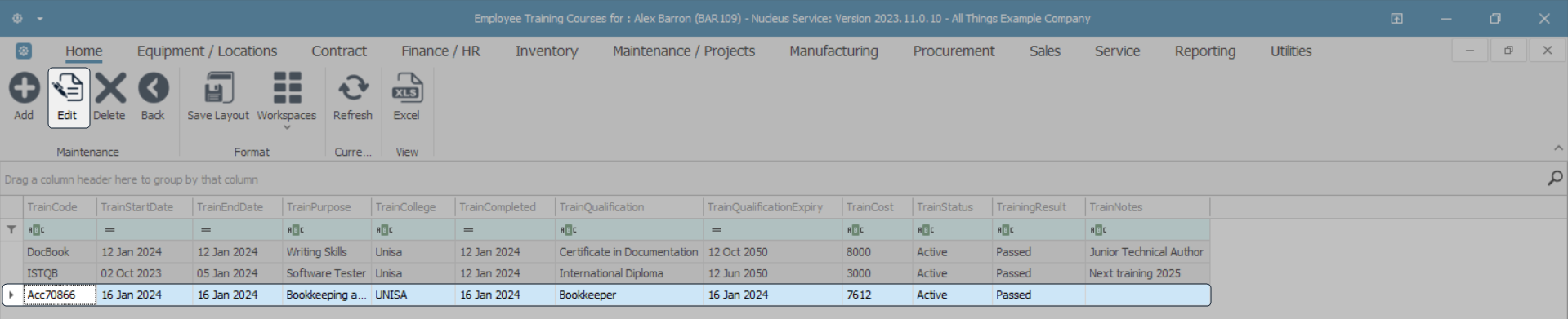 - Use the row selector to highlight the employee you wish to add qualification or training course details to.