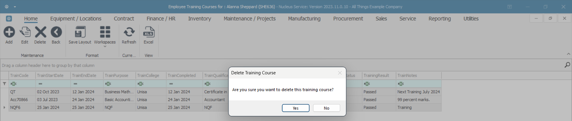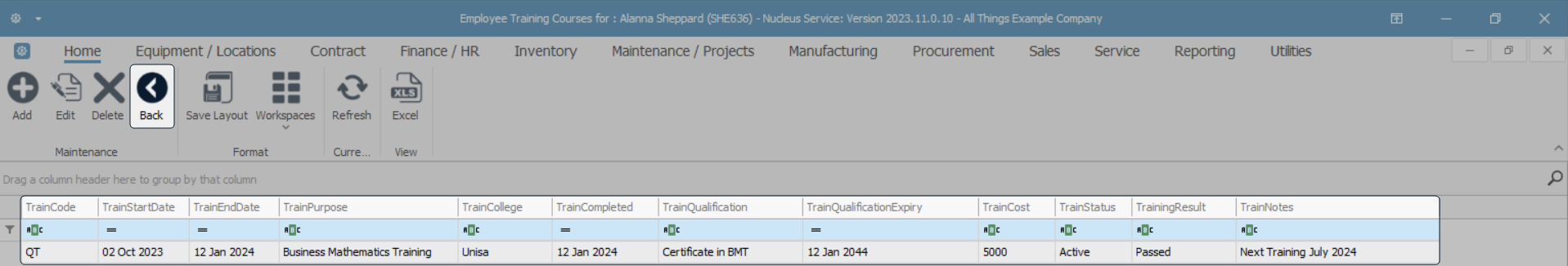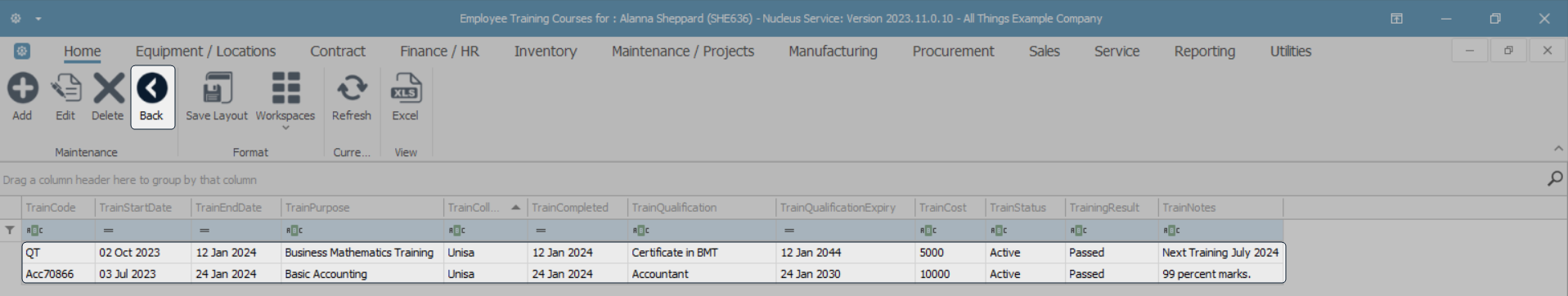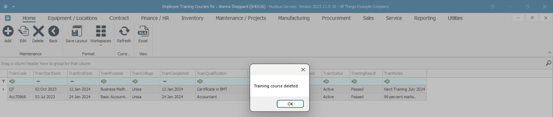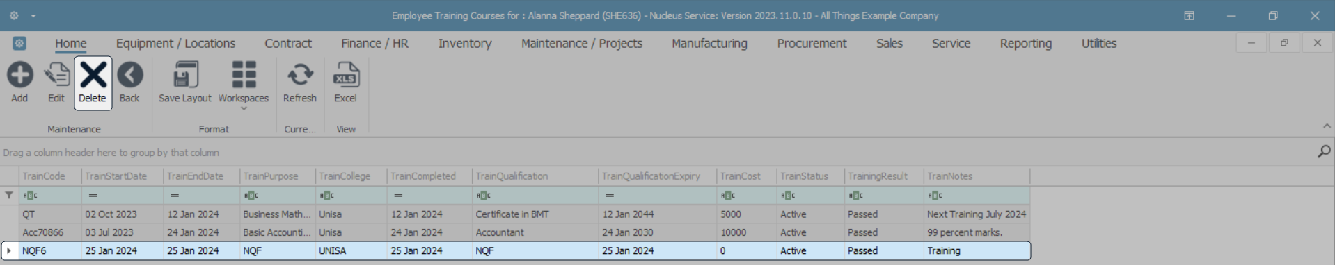 - You will return to the Employee Training Courses for : [ ] screen where the selected training course details have been removed from the data grid.