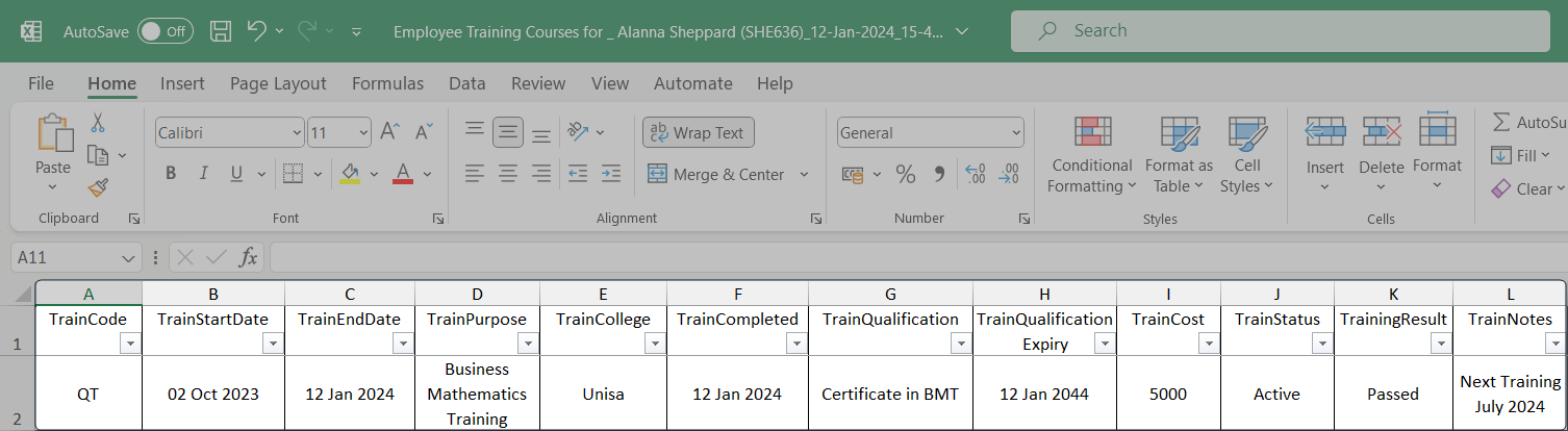 - This will open an MS Excel spreadsheet with all the data from the data grid.