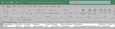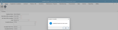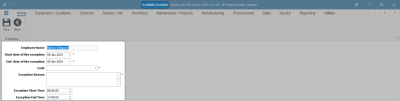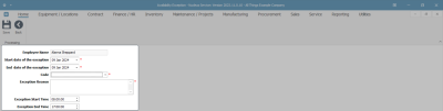 - The Availability Exceptions for : [ ] screen will open where you can view the selected employee's details in the data grid.