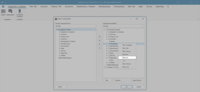 - The left-hand side of this screen is the Choose commands from: menu which contains a list of all the Tabs and Commands available in Nucleus Service.
