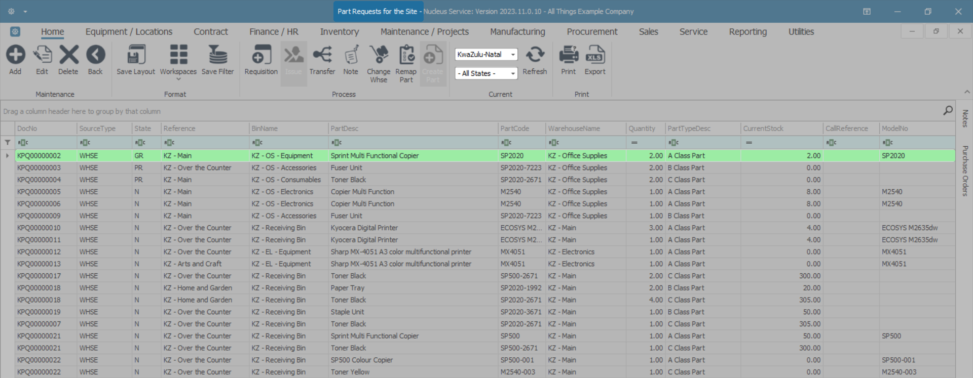 - The list of part requests displayed will be dependant on the Site and State selected.
