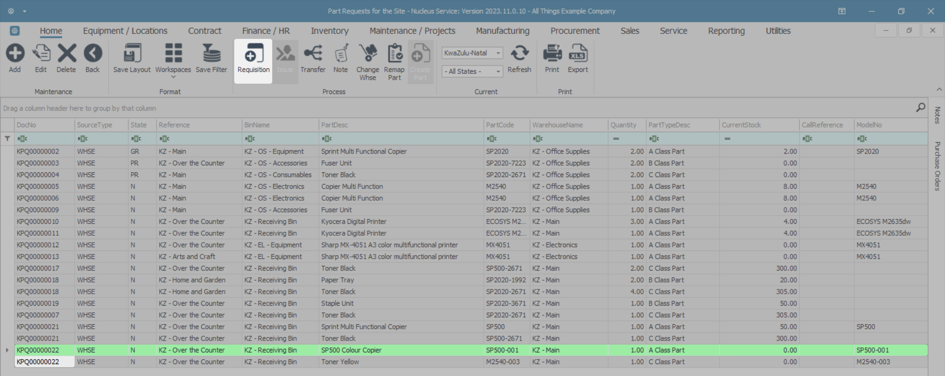Ribbon Select Inventory > Part Requests