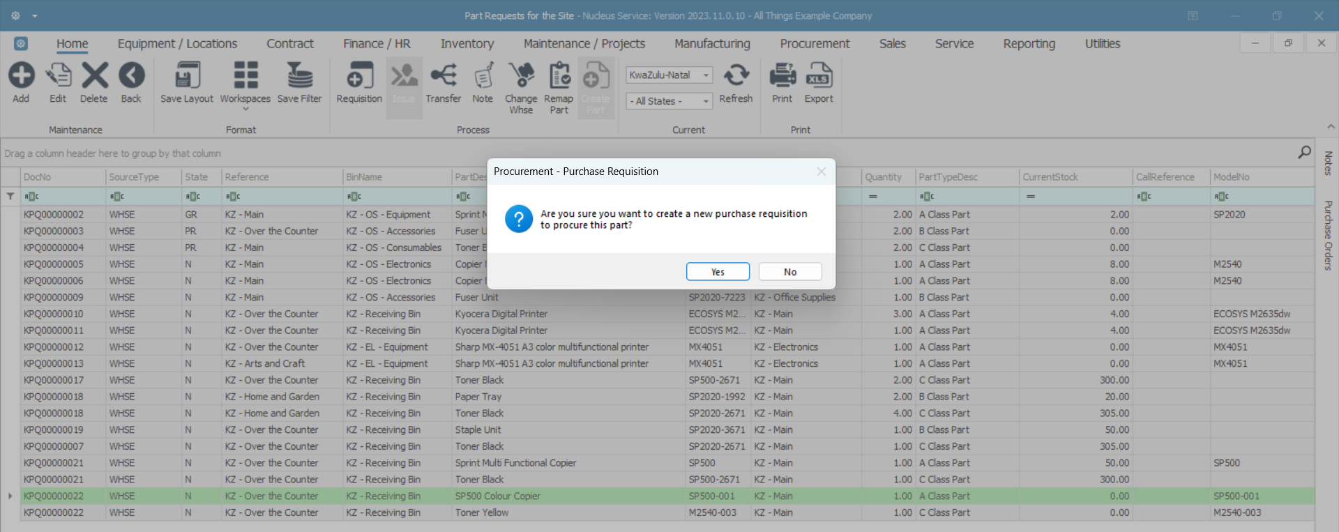 - Are you sure you want to create a new purchase requisition to procure this part?