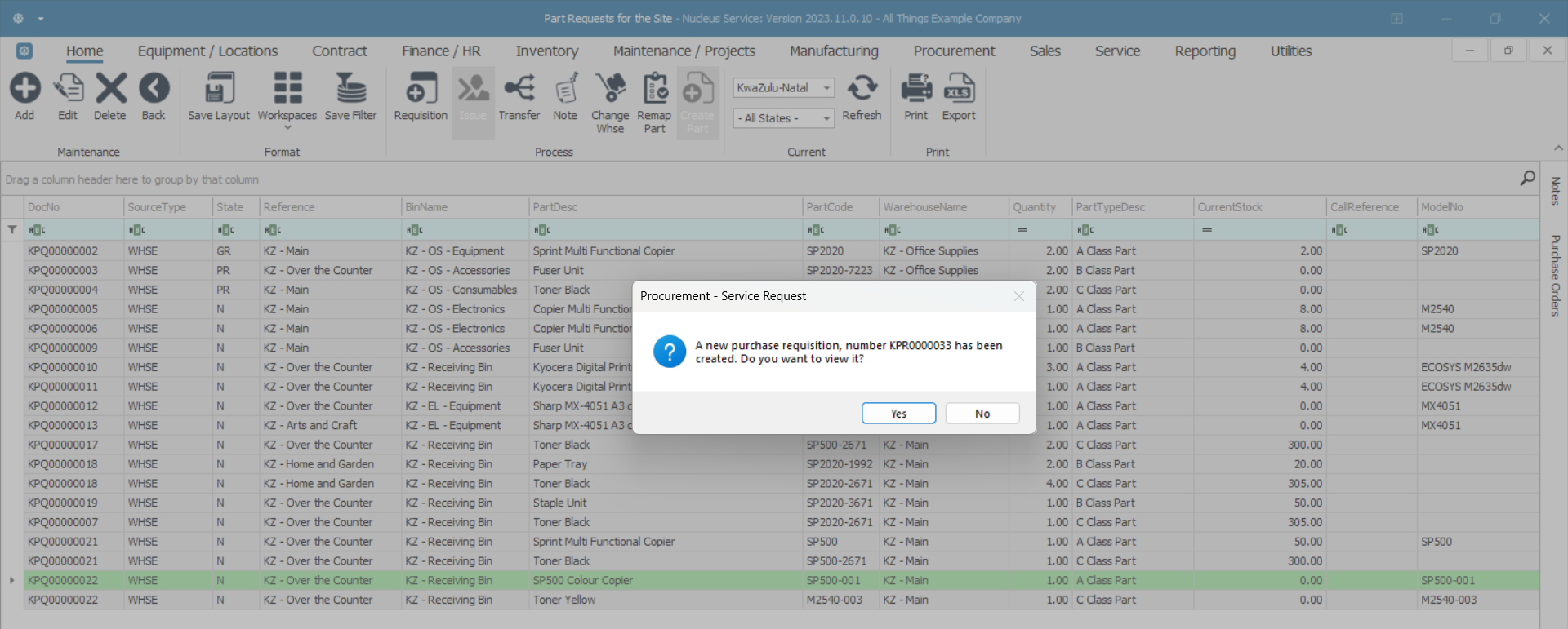 - A new purchase requisition, number [ ] has been created. Do you want to view it?