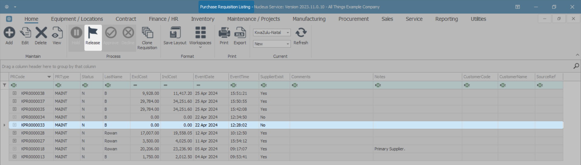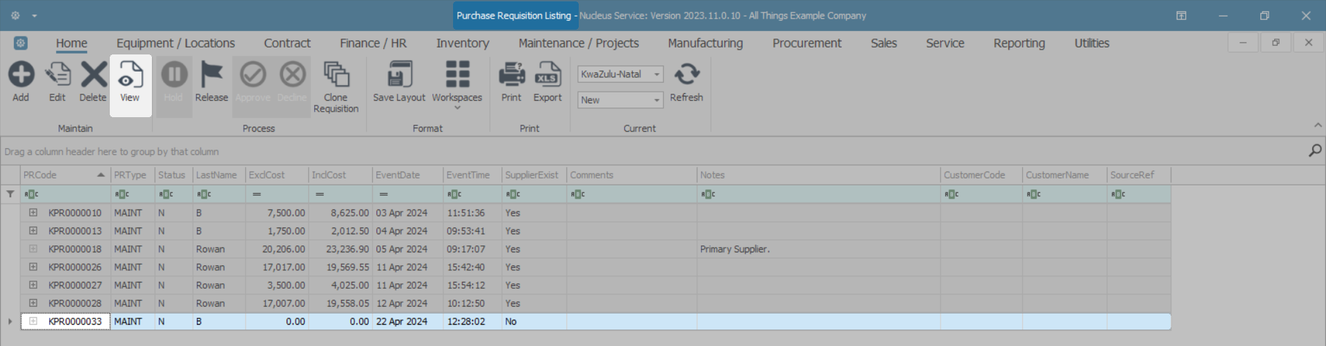 - The Purchase Requisition Listing screen will open.