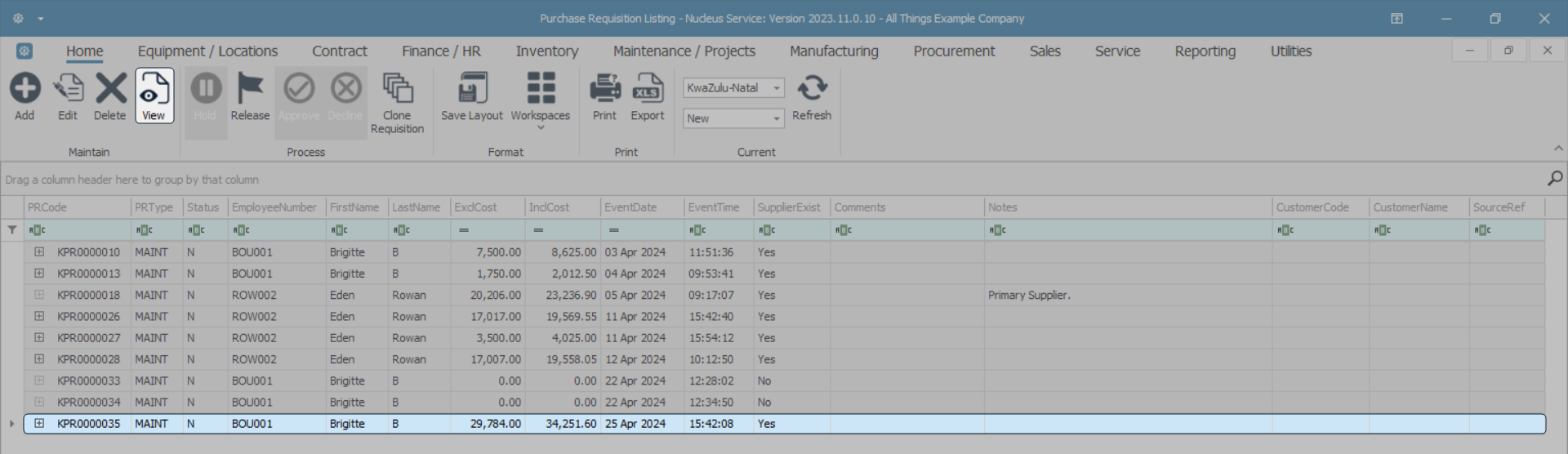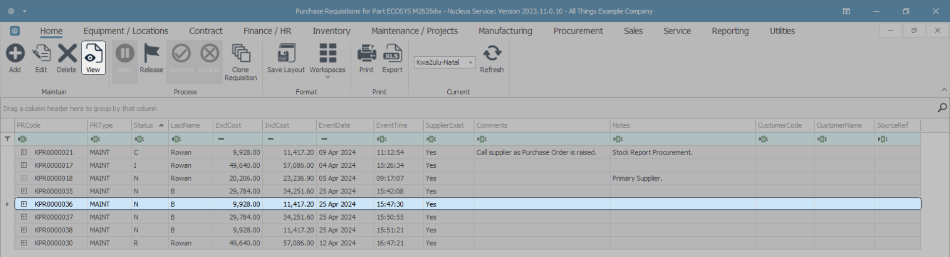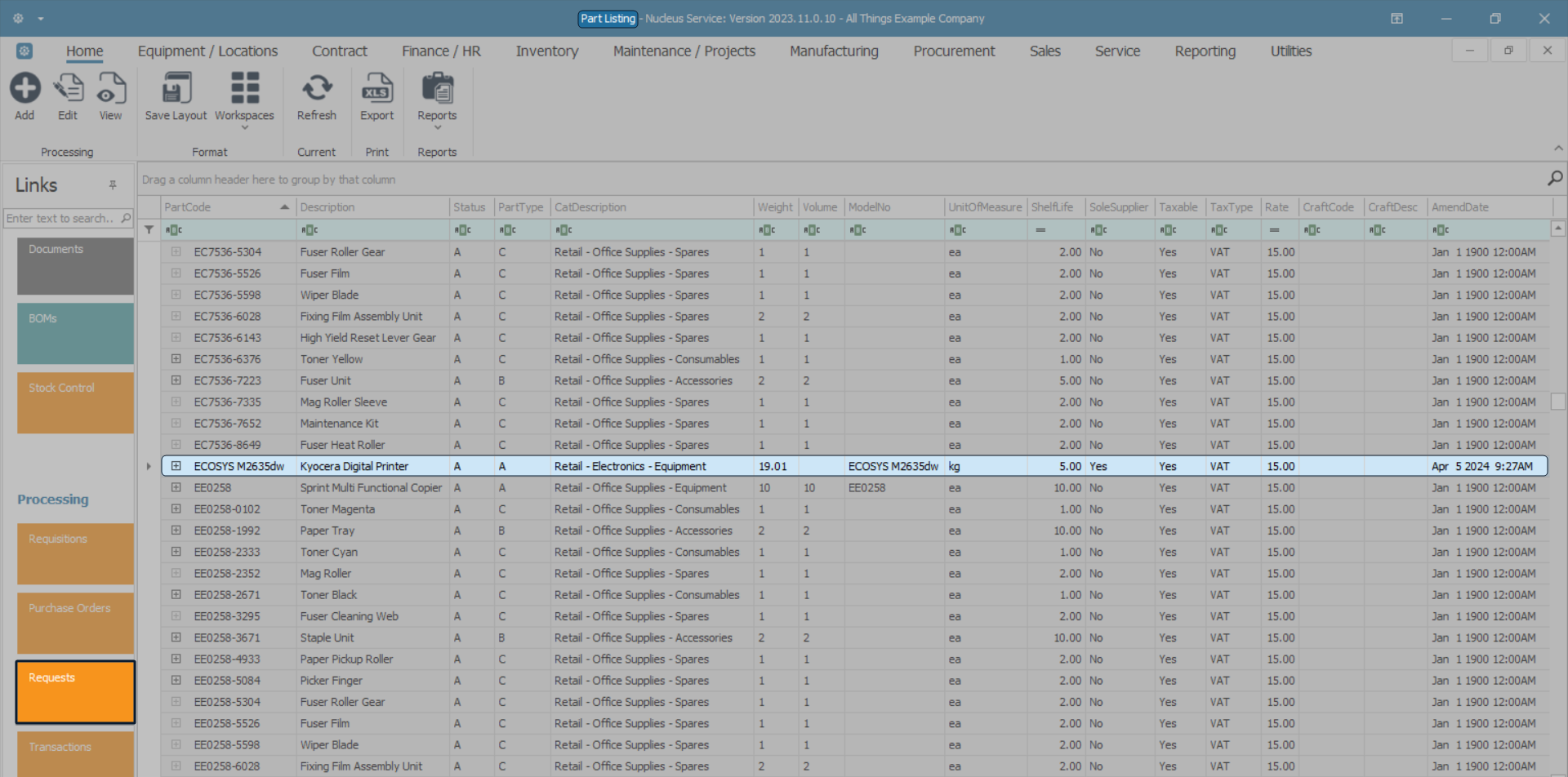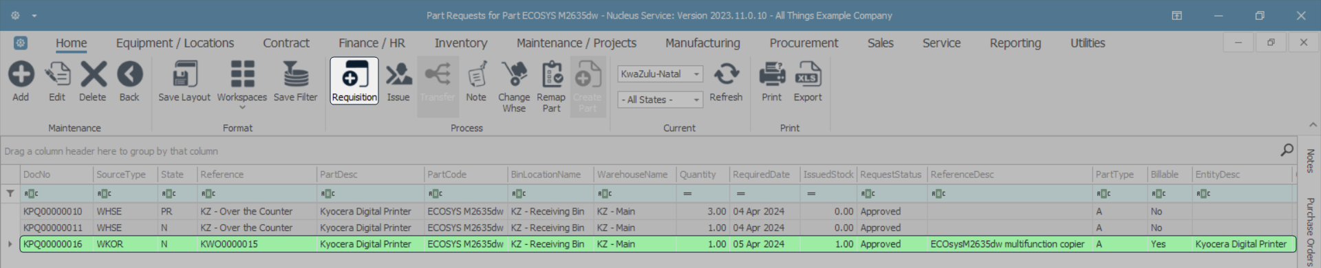 - Scroll through the data grid or use the The Auto Filter Row to find the part request you wish to fulfil by raising a requisition.