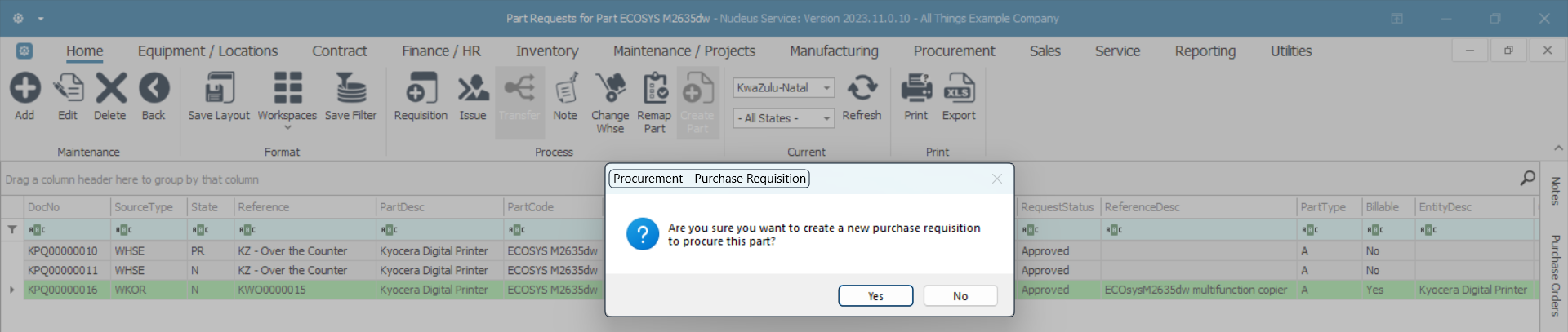 - Are you sure you want to create a new purchase requisition to procure this part?