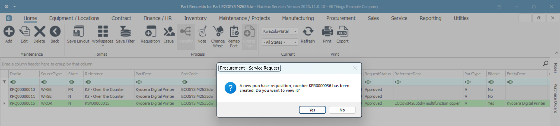 - A new purchase requisition, number [ ] has been created. Do you want to view it?