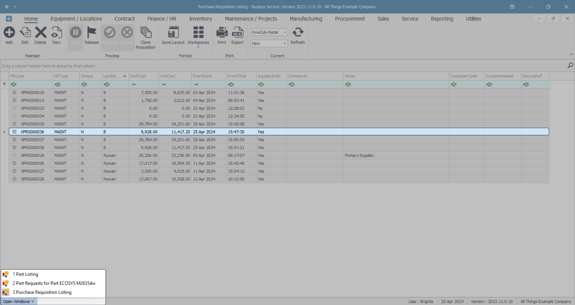 Although the system has directed you to the Procurement module to view the new purchase requisition, it can also be viewed from the Part Listing screen.