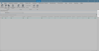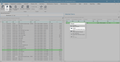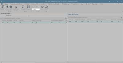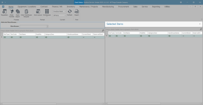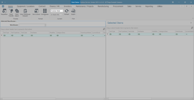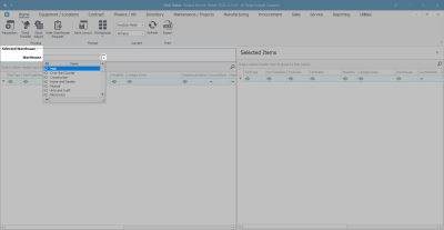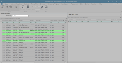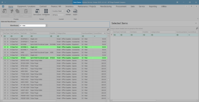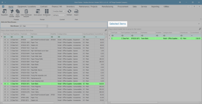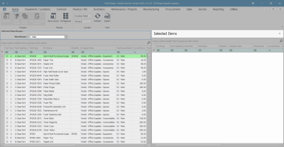 - The Selected Warehouse frame will now be populated with the stock details of all the parts / equipment items linked to that warehouse.