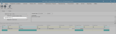 - In the Selected Warehouse frame, click and hold anywhere in the row of the item line that you wish to transfer.