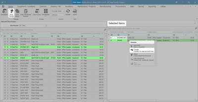 Note: You will see that this Selected Items header row contains exactly the same header row details as the Selected Warehouse panel.