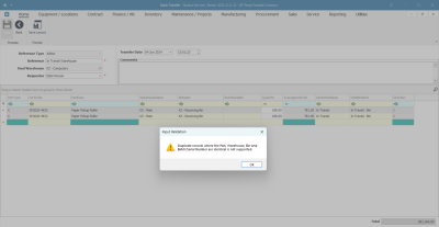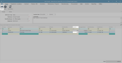 - You will note that the system has auto populated the Destination Warehouse Name and Destination Bin Name fields with the name of the In-Transit Warehouse and bin as set up in Warehouse Configuration.