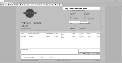 The Report Preview screen for the Part Transfer Note will be displayed.