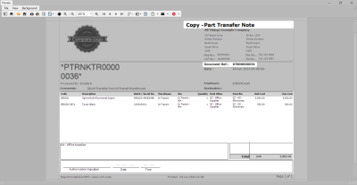 The Report Preview screen for the Part Transfer Note will be displayed.
