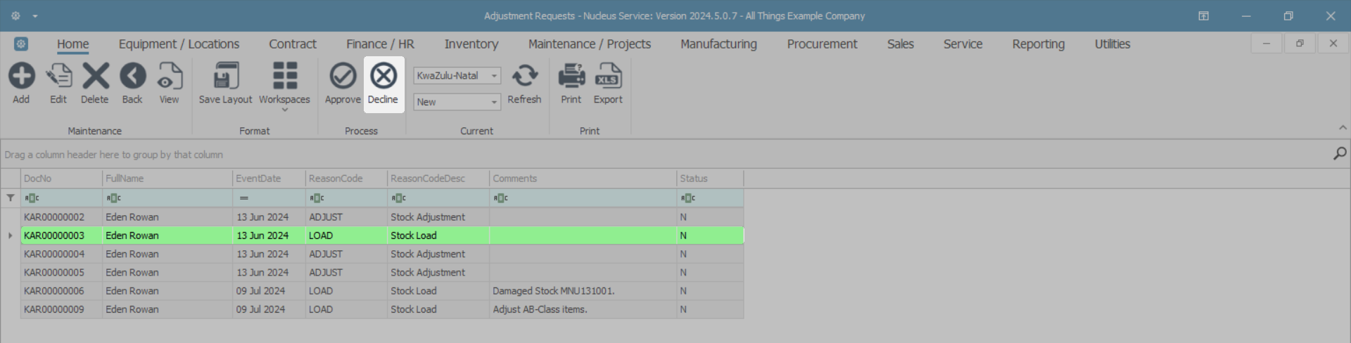 - Select the row of the Adjustment Request you wish to reject.