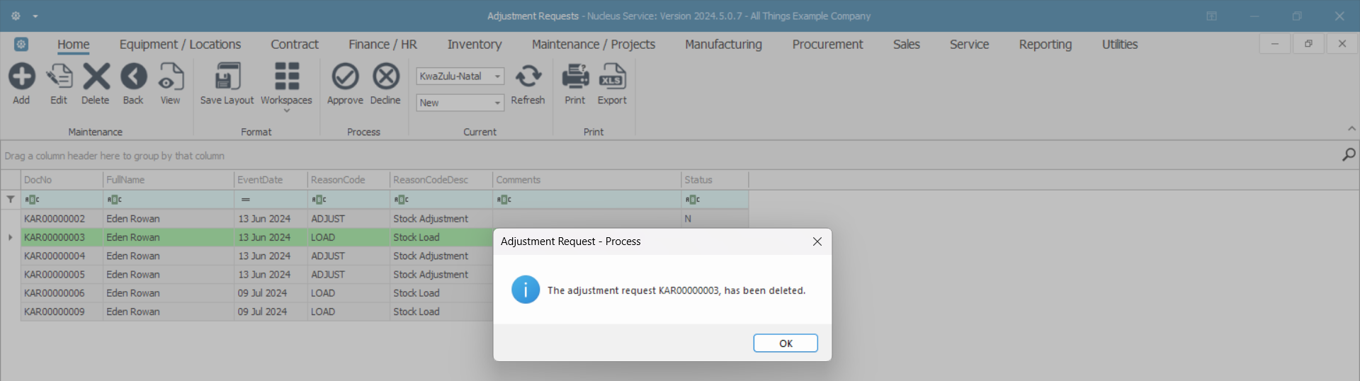- The Adjustment Request [ ] has been deleted.