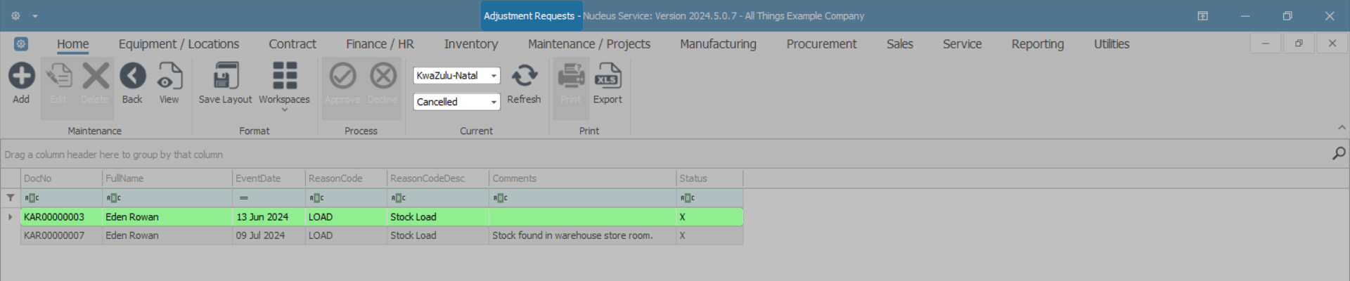 - The selected adjustment request will now be moved to the Adjustment Requests listing screen, where the status is set to Cancelled.