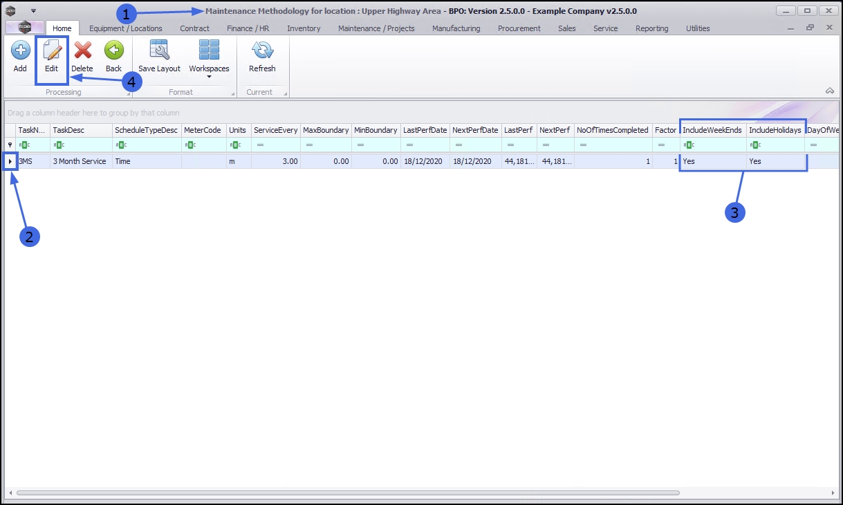 - Note that the Include Weekends and Include Holidays columns have been updated to 'No' as per the changes made in the previous screen.