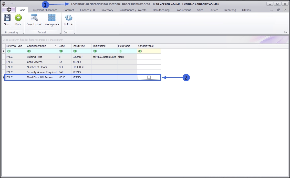 - If you wish to view the Technical Specifications of a main location, select the row of that main location. In this example Upper Highway Area is a main location.