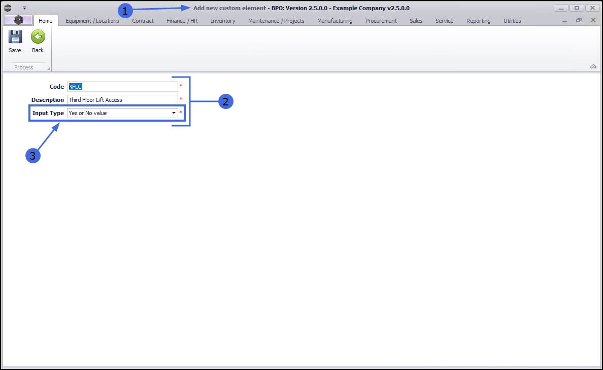 - Input Type: Type in the input type for this element e.g. Free input text, Lookup list, Yes or No value.