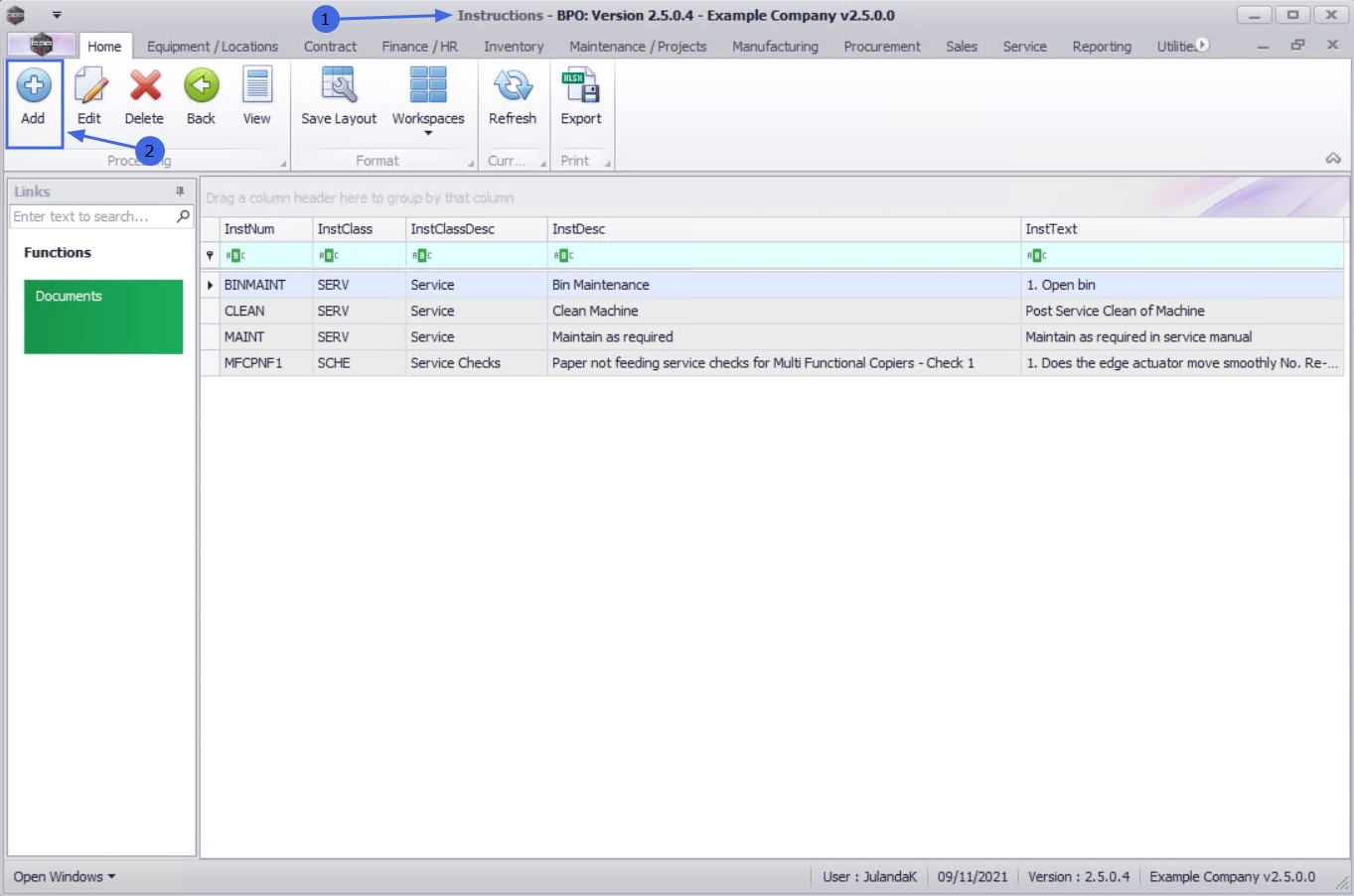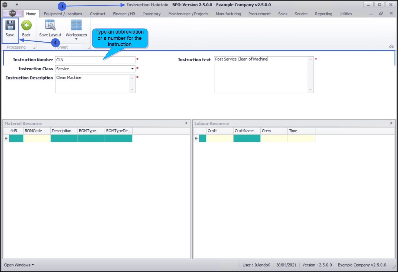 | Ribbon Access: Maintenance / Projects > Instructions |