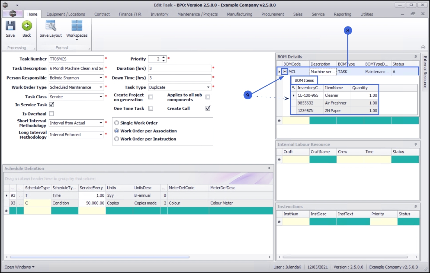 - Expand the BOM Items frame to view a list of all the items required to complete the task.