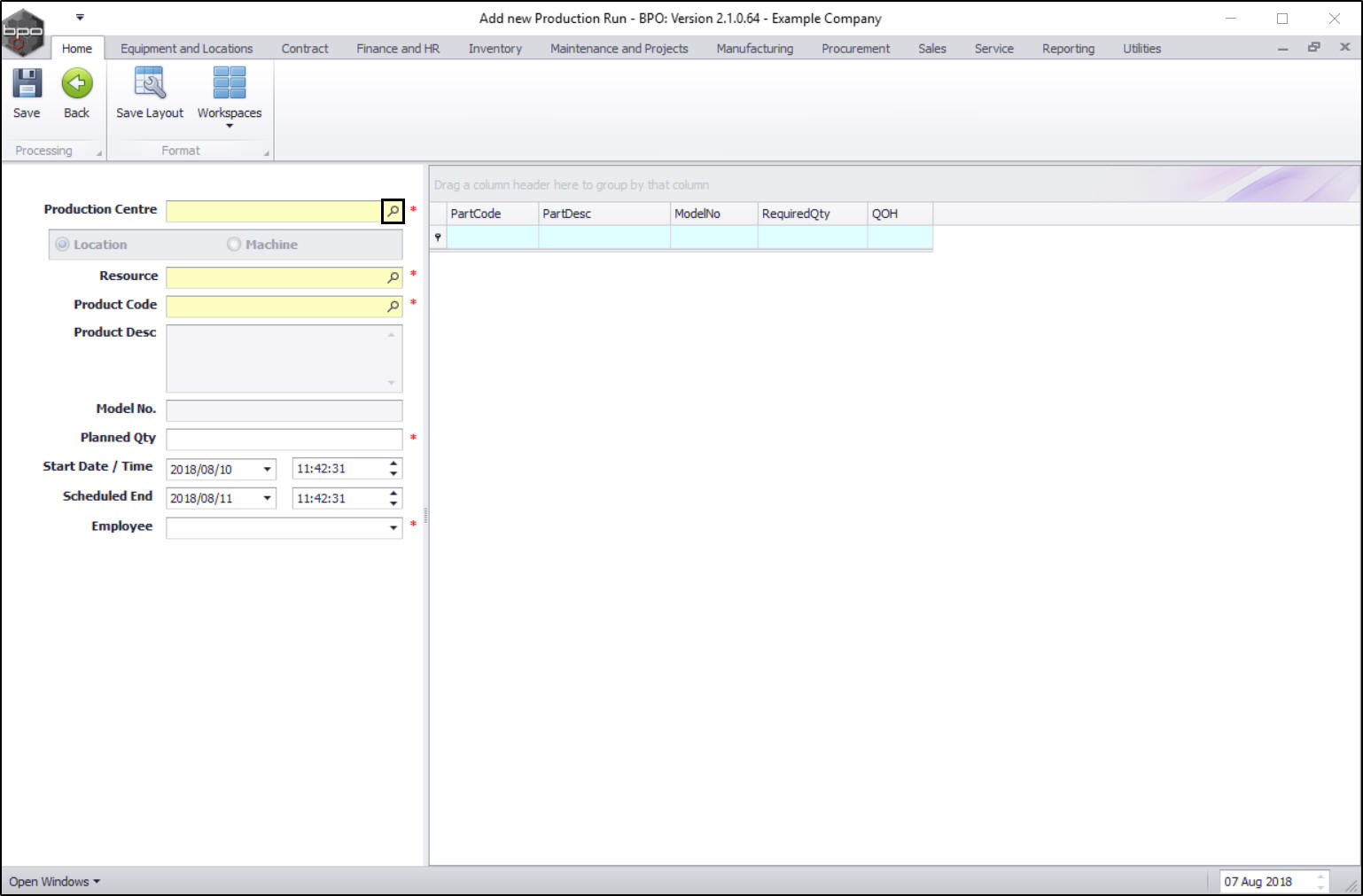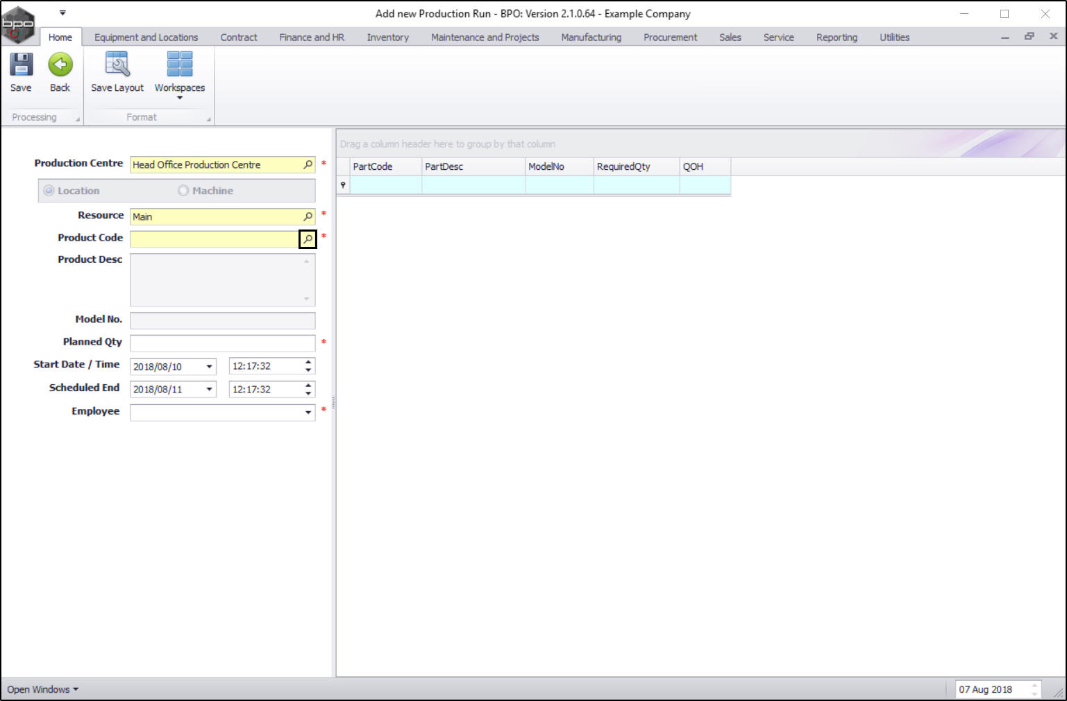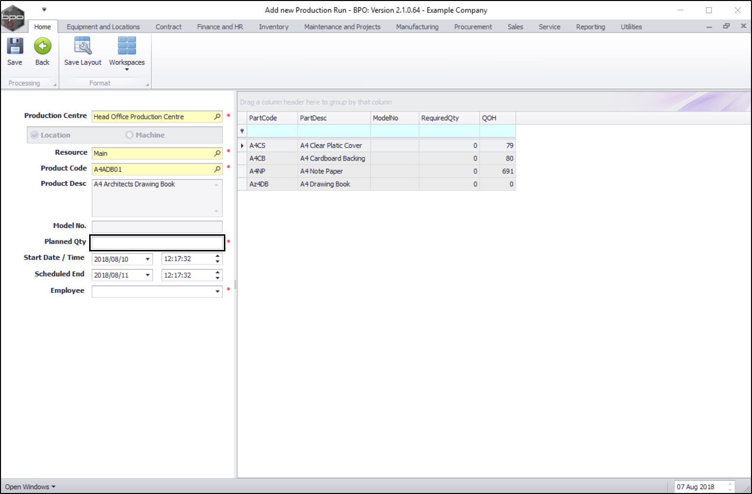 - When you have selected the Planned Quantity amount, the Parts data grid will now populate with the Required Quantity needed to complete the production run.