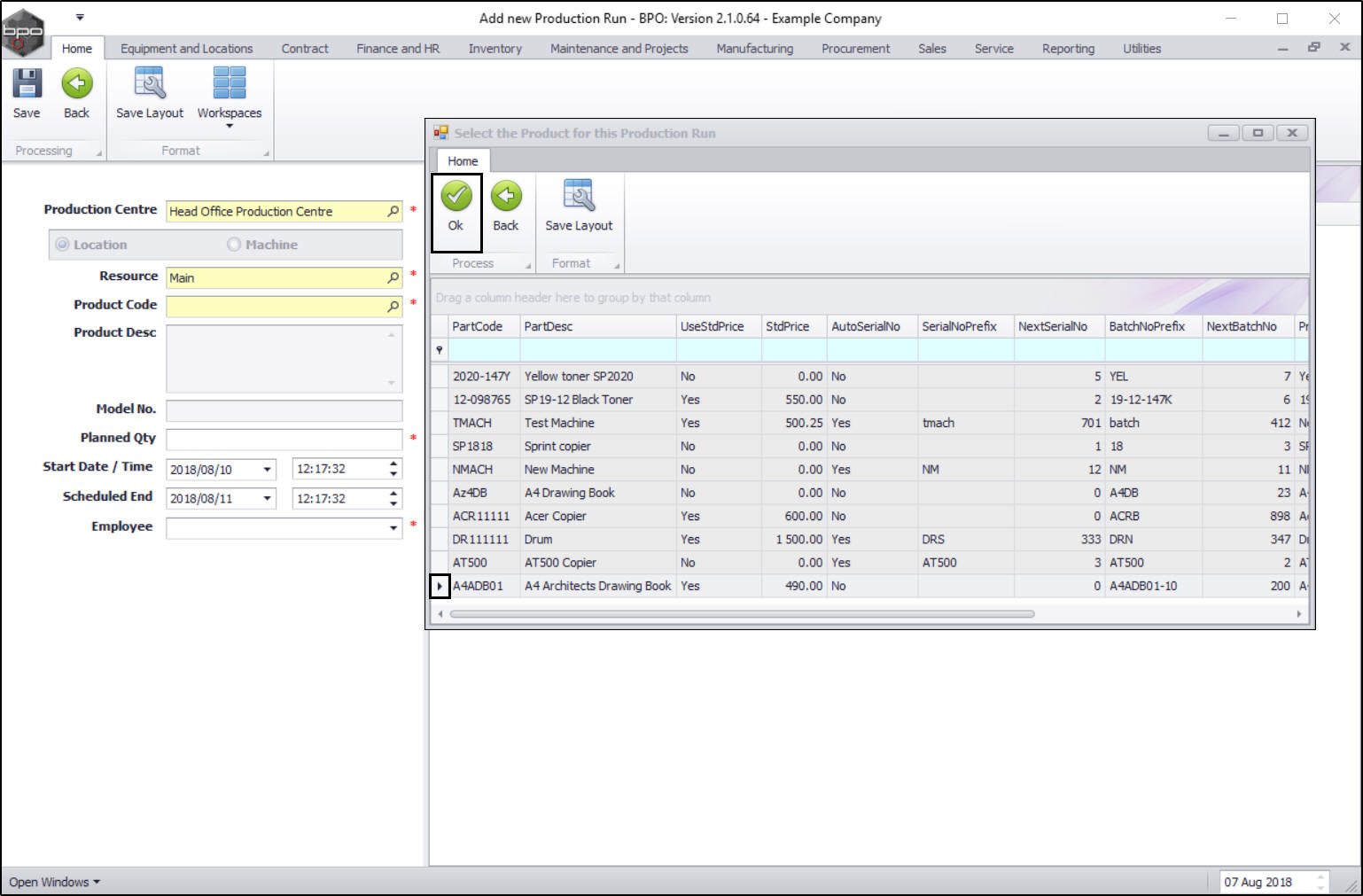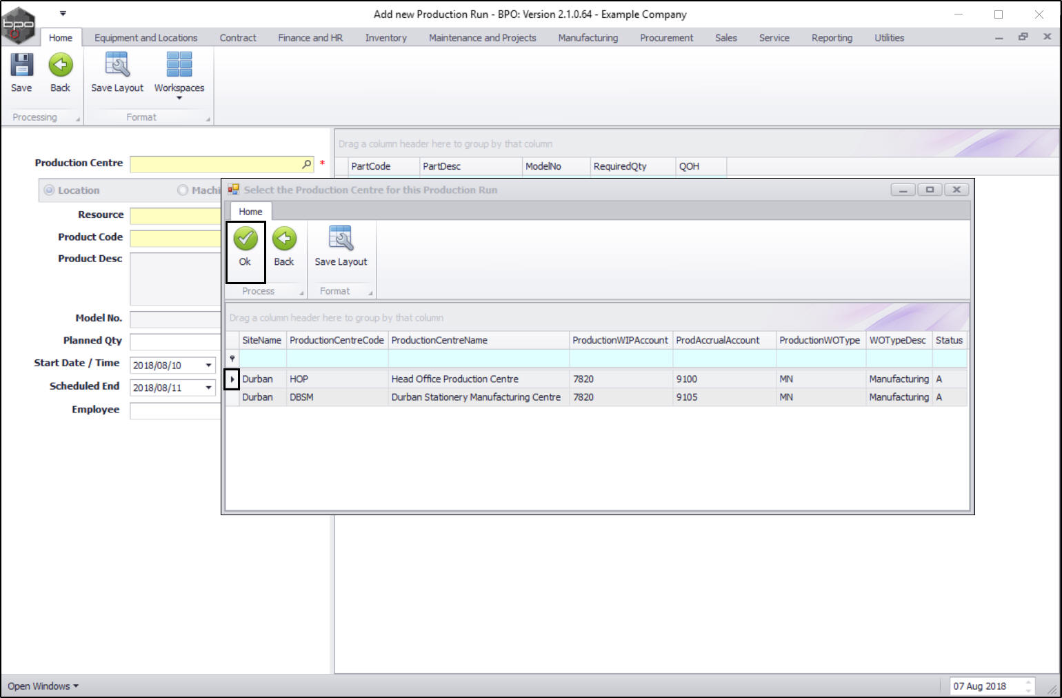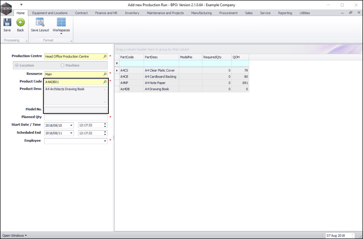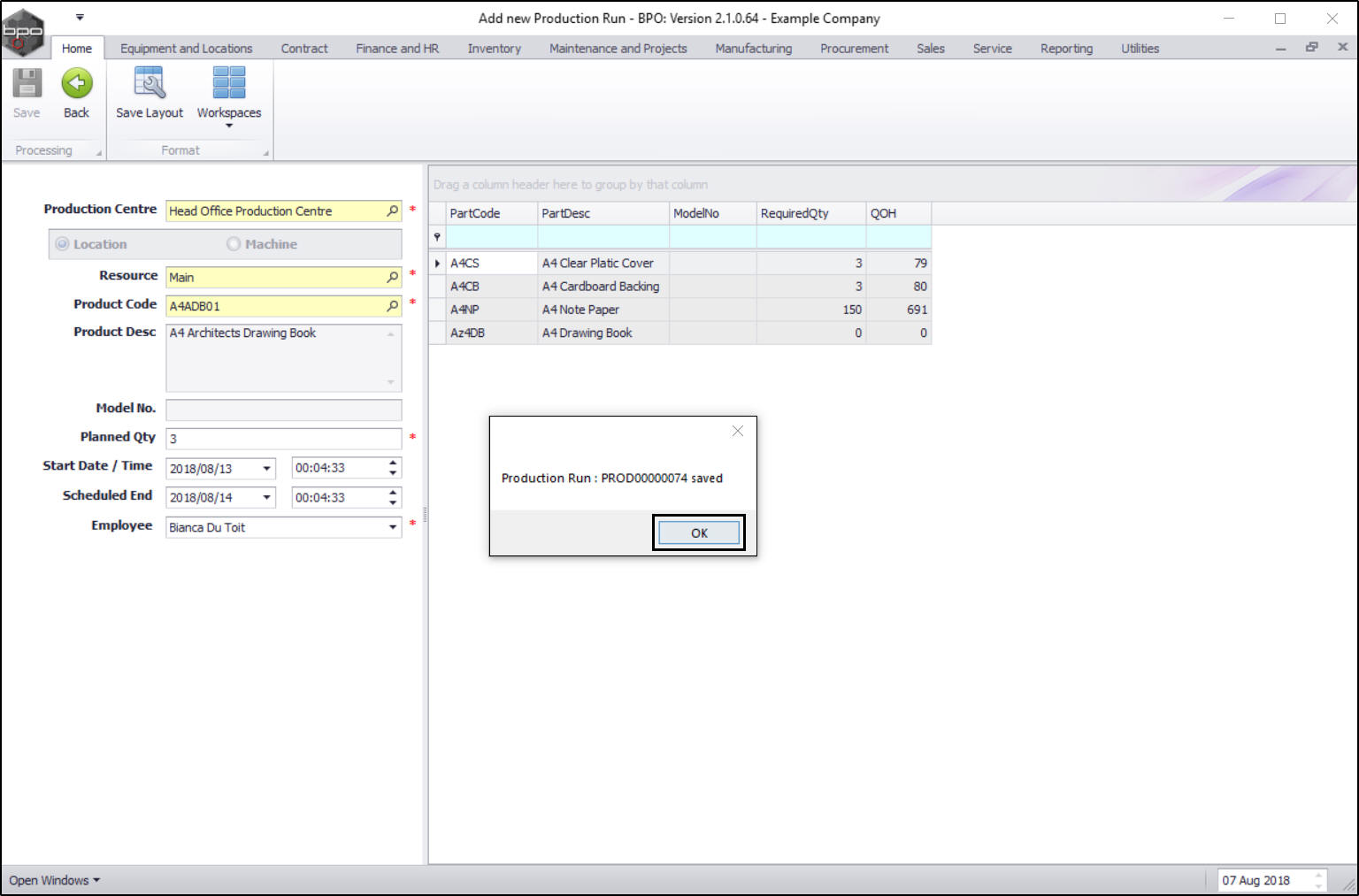 - When you have selected the Planned Quantity amount, the Parts data grid will now populate with the Required Quantity needed to complete the production run.