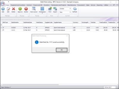 - Click on the row selector in front of the Supplier Debit Note to be approved.
