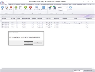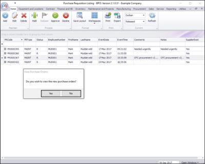 - Click on No, if you want to remain in the Purchase Requisition Listing screen.