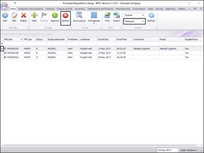- Select the row of the requisition you wish to decline.