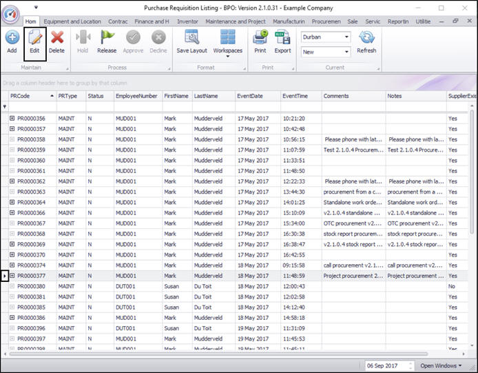 - Select the row of the purchase requisition where you wish to add a new Note and/or Comment.