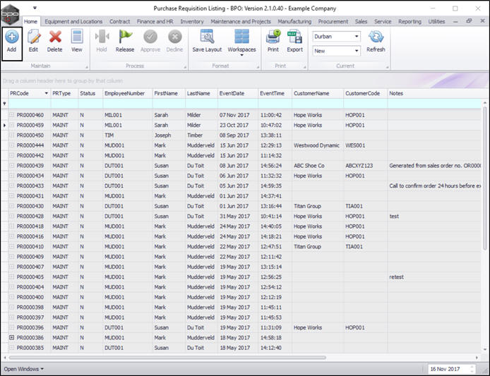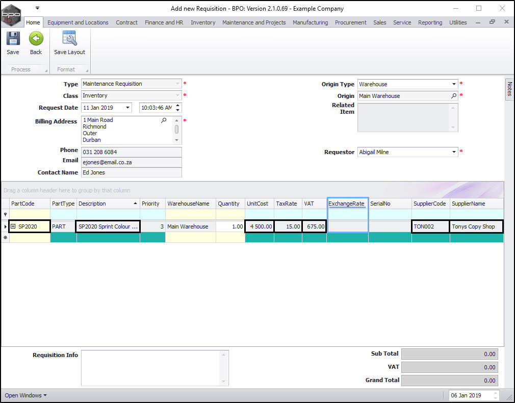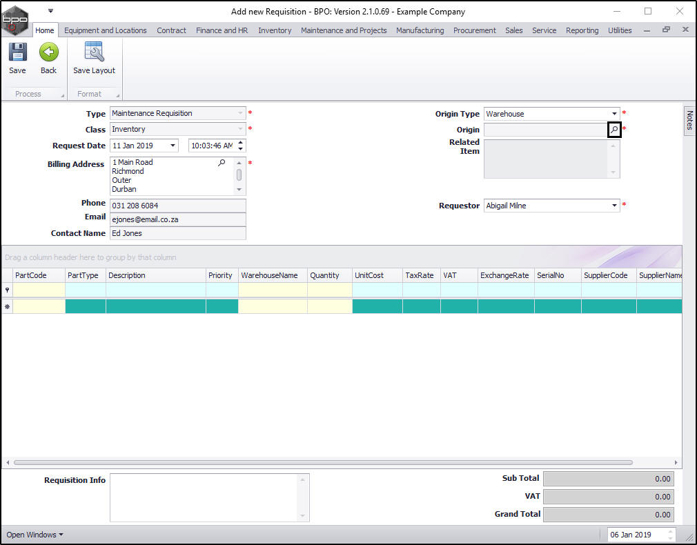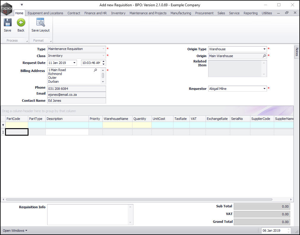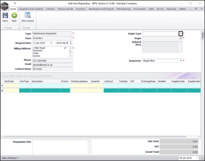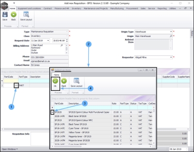 - Click in the Part Code field of the new row, to display the ellipsis button and continue to add A, B or C-Class items in this way until you have finished adding items to the requisition.