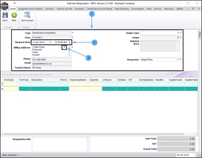 - The requisition header frame will auto populate with most of the relevant details. Most of these are uneditable fields except the following: